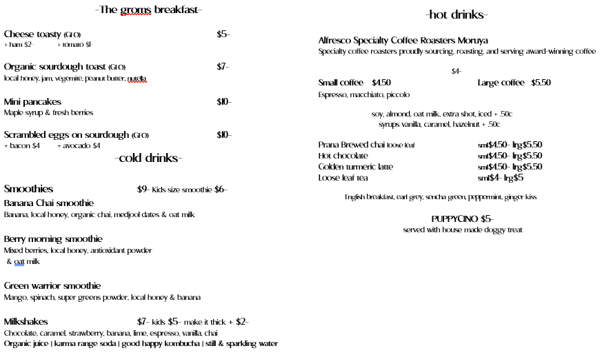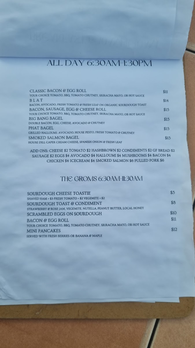 Start your day with the Groms Breakfast, featuring items like the cheesy toastie and fluffy mini pancakes. For an all-day feast, indulge in favorites such as the classic bacon and egg roll on soft milk buns or the innovative Big Bang Bagel. At lunch, the nourishing bowls and seasonal wraps promise to satisfy those seeking something fresh and wholesome.